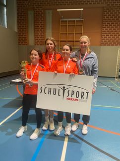 Die Mädchen der 4c Klasse Helena Goldmann, Antonia Hämmerle, Luisa Bechtold, Rosa Bitsche mit Unterstützung von Pia Lässer aus der 2c, da Celine Weigand leider krank war, starteten hochmotiviert in den Finaltag in Nenzing. Das entscheidende Spiel gegen die 4. Sportklasse aus Nenzing fand auf Augenhöhe statt. Kapitänin Helena riss die ganze Mannschaft mit ihrem Siegeswillen mit und konnte am Ende der spannenden Partie die entscheidenden Siegespunkte machen. Die Freude über den Sieg war riesengroß, dank einer tollen Mannschaftsleistung!