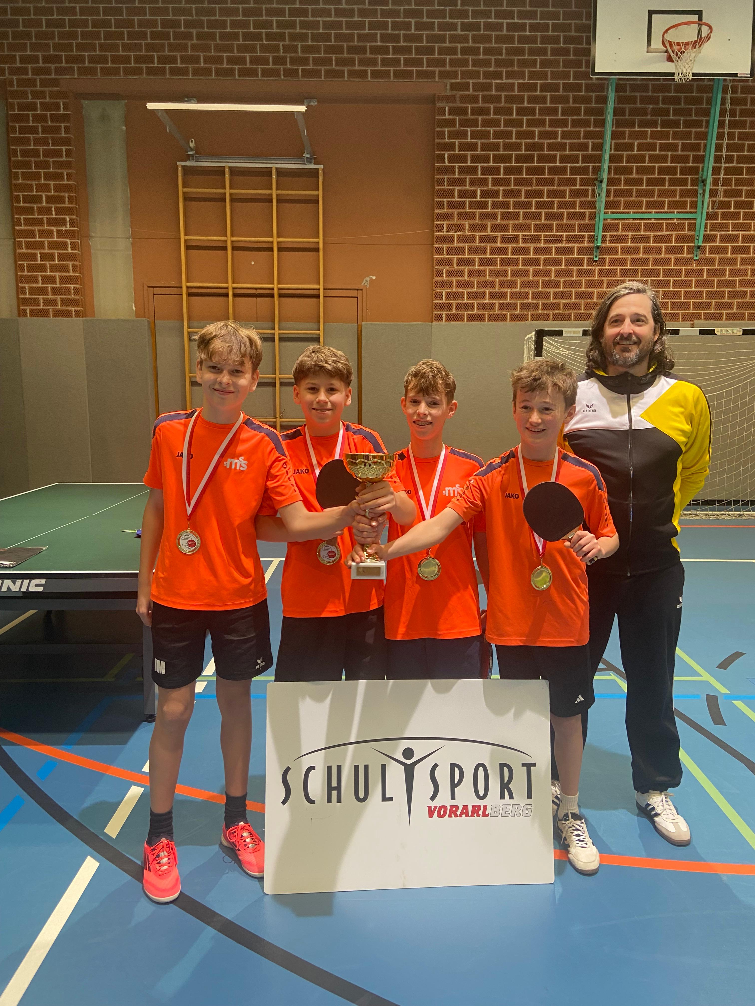 Bei den diesjährigen Schulmeisterschaften im Tischtennis in der MS Altach konnten die Mädchen der 4c (Pia, Neela, Anna) ihren Vorjahreserfolg (damals noch als 3c-Klasse) wiederholen und siegten klar vor dem Team der SMS Nenzing und unserem Mädchenteam der heurigen 3c aus Satteins. Die Knaben aus der 4c wurden Dritte hinter Sieger SMS Nenzing und den Zweitplatzierten vom Gymnasium Lustenau. Das Team der 3c belegte den 5. Rang. Wir gratulieren!