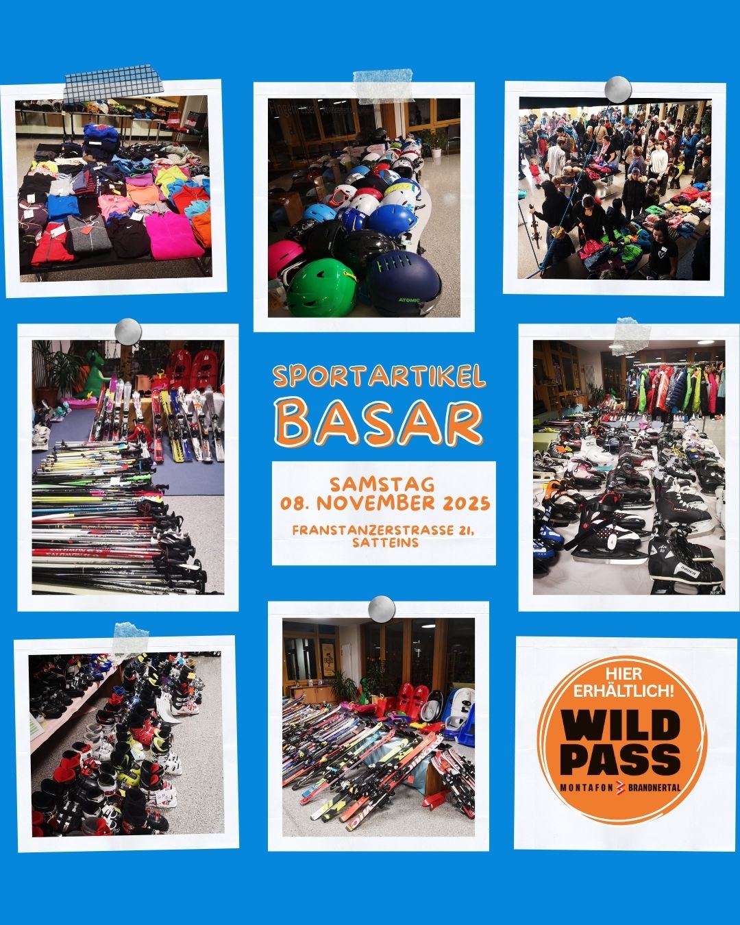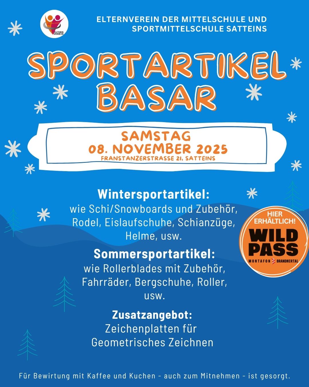 Der Elternverein der Mittelschule Satteins lädt herzlich zu einem Sportartikelbasar ein. Angeboten werden Wintersportartikel (z. B.: Schi, Schischuhe und -stöcke, Snowboards, Helme, Rodel, Eislaufschuhe usw.) und Wintersportbekleidung sowie Sommersportartikel (z. B.: Rollerblades, Fahrräder, Bergschuhe, Roller usw.). Zusatzangebot: Zeichenplatten für Geometrisches Zeichnen